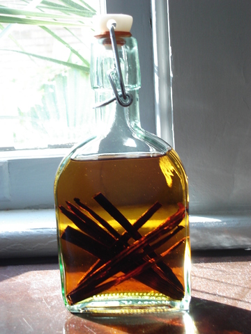 Some people use vodka or brandy, but I prefer the mellowness that bourbon lends. The most fragrant proportion is one bean for every quarter cup of alcohol, about half the alcohol usually called for in these infusions. You simply split the bean lengthwise, halve it, put it into a clean glass jar and cover it with the prescribed amount of booze. Seal and give it a vigorous shake, then put it in a cool dark cupboard that you’ll be going into every day. For the first week or two, give it a shake every day.