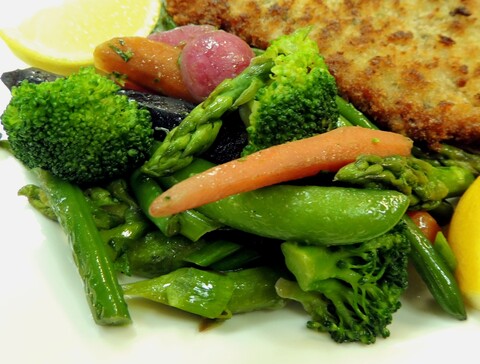 1. Scrub the carrots well under cold running water. If they aren’t very young, peel them, but if they’re small, young, and really fresh, peeling them would be a shame. Trim their green tops, leaving a little of the sprout. If the tops are bright and fresh, you may cut back on the parsley garnish to a tablespoon or less, and set the carrot fronds aside to add to it. If the carrots are small, leave them whole; if larger, cut on the diagonal into 2-3 pieces. Scrub, trim and halve the radishes, leaving a little of the sprout attached. Peel the tough parts of the asparagus stems and cut them on the diagonal into 2-inch pieces. Remove the stem end of the beans and cut them in half. Rinse and string the peas, but leave them whole.