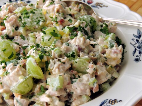 About two-thirds of a left over roasted chicken, half a bag of green grapes languishing in the vegetable bin, and a new bundle of scallions. Add in a steaming afternoon in which cooking is out of the question. For most people, the logical sum of all that would’ve been chicken salad with grapes, a modern standard that has been enjoyed all over our country for more than thirty years.