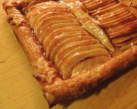 1. Roll out about 2/3 of the pastry into a rectangle about 12 by 14 inches, 1/8-inch thick. Roll it loosely onto the rolling pin and then unroll onto buttered baking sheet. Roll out enough of the remaining dough to cut ¾-inch wide strips to cover edges of tart twice. Brush the edges of the crust lightly with cold water and lay the wide strips of dough over it, overlapping the ends, and trim off the excess. Brush edge strips with water and repeat with remaining strips. Refrigerate while preparing apples, at least 20 minutes.