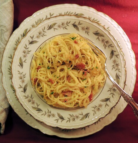 Over the course of those four precious months, she taught me a lot about Italian cooking, including the way she made her richly fragrant spaghetti alla carbonara, the first “real” Italian food I tasted on its native turf. It was like nothing I had ever had before, and yet, in a funny way, it whispered of everything good about my childhood, while at the same time embodying everything that I had fallen for about Italy. It has been a comfort food standard in my kitchen ever since.