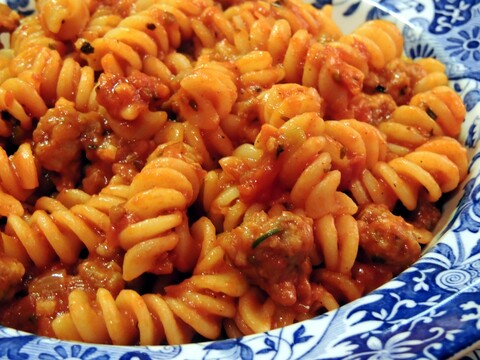 Recipe testing and food styling for my books and newspaper stories almost always leave some interesting leftovers and scraps behind. After finishing a story featuring some of the celebrated pasta dishes from earthquake-devastated Lazio, Marche, and Umbria, there was half a pound of mild Italian sausage, about one-and-a-half cups of tomato puree from a large can of tomatoes, and barely 2 ounces of pecorino romano cheese in the refrigerator.