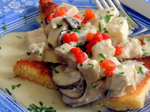 In many old recipes, the base is a true cream sauce that contains no broth at all, in others, a modified velouté-style sauce with broth, cream, and a flour liaison, and a few (including a couple claimed to be the original) are cream sauce lightly thickened with flour and egg yolks. Though originally served over toast or vol-au-vent (puff pastry cups), today it’s also commonly served with rice (one frozen entrée is even packaged with rice) and some serve it over noodles.