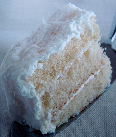 7. Frost the top and sides of the cake, turning the plate so that the unfrosted areas face you as you go, and pat the rest of the coconut evenly over the frosting. Spoon the remaining juice over the top of the cake a spoonful at a time, letting it soak in before adding more. Restrain yourself and let the cake sit for at least 24 hours before cutting it. Once it is cut, keep it well covered and, if the cake should last more than 3 days (I wouldn’t know; mine never has), keep it refrigerated.