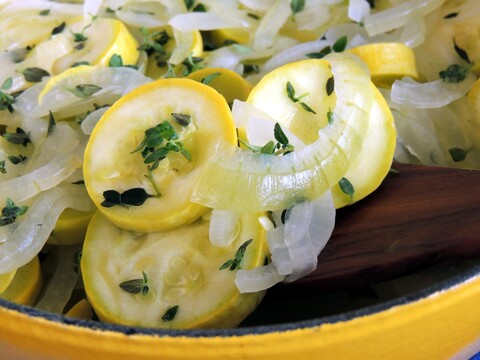 The thyme is my addition: My grandmother didn't grow or use it except when it was included in the powdered herb blend marketed as poultry seasoning. But it makes a lovely pairing with yellow squash. You can omit it or try another herb such as oregano, sage, or summer savory.