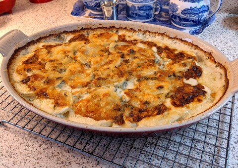 3. Bake in the center of the oven until it's golden brown, bubbly to the center, and the potatoes are tender, between 1¼-1½ hours, depending on your oven and the dish you've used. Check after about forty-five minutes and turn the dish if it appears to be browning unevenly. To test for doneness, insert a sharp paring knife or toothpick into the center. It should slip in easily with no resistance. Serve hot.