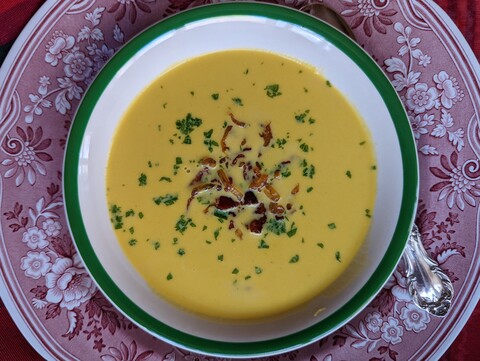 Winter Squash or Pumpkin Soup with Bacon and Caramelized Shallots