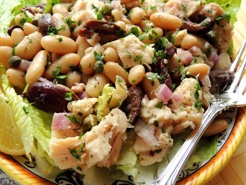 There's just so much cooking one can do under those conditions, and what little I have been doing involves things that I don't have to stand over, or that are in and out of the pan in a hurry: that cold summer squash puree from last month, cold minestrone finished with a spoonful of pesto, my grandmother's salmon cakes, Mrs. Randolph's whole okra that's done in four minutes and best enjoyed at room temperature, quick pasta sauces like zucchini sautéed with garlic and oil, and, of course, those lovely, cooling composed salads like salmagundi and salade nicoise.